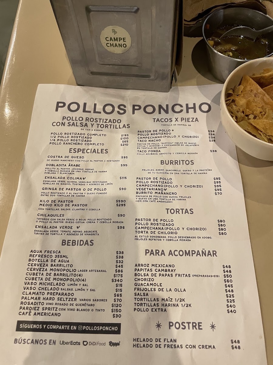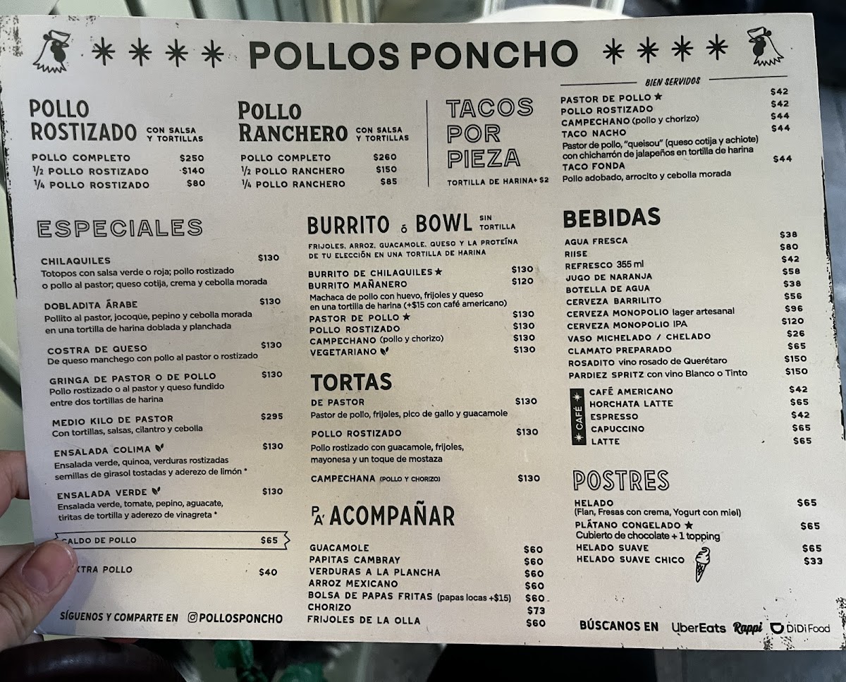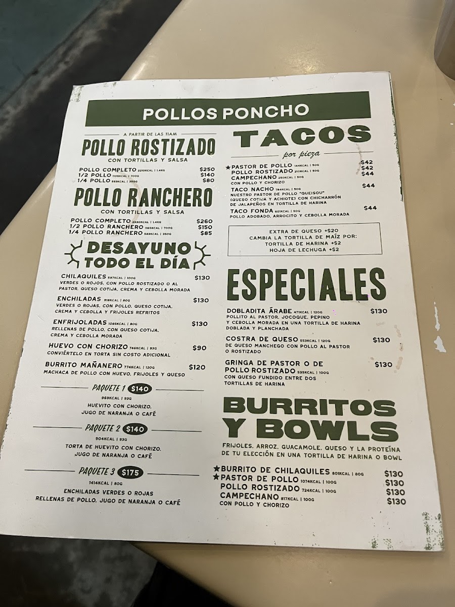 Welcome to Pollos Poncho, a hidden gem in the heart of Roma Norte, Mexico City, where chicken reigns supreme. This vibrant eatery focuses on delivering bold, authentic flavors in a casual setting, making it a favorite for both locals and visitors. The menu features a variety of dishes, but some standout highlights include the tender pastor de pollo and succulent pollo rostizado. Customers rave about the taco offerings, particularly the mouth-watering Taco Fonda, which is a must-try. Diners can't get enough of the addictive house-made salsas, especially the red salsa that adds a delightful kick.