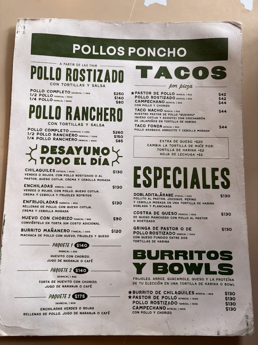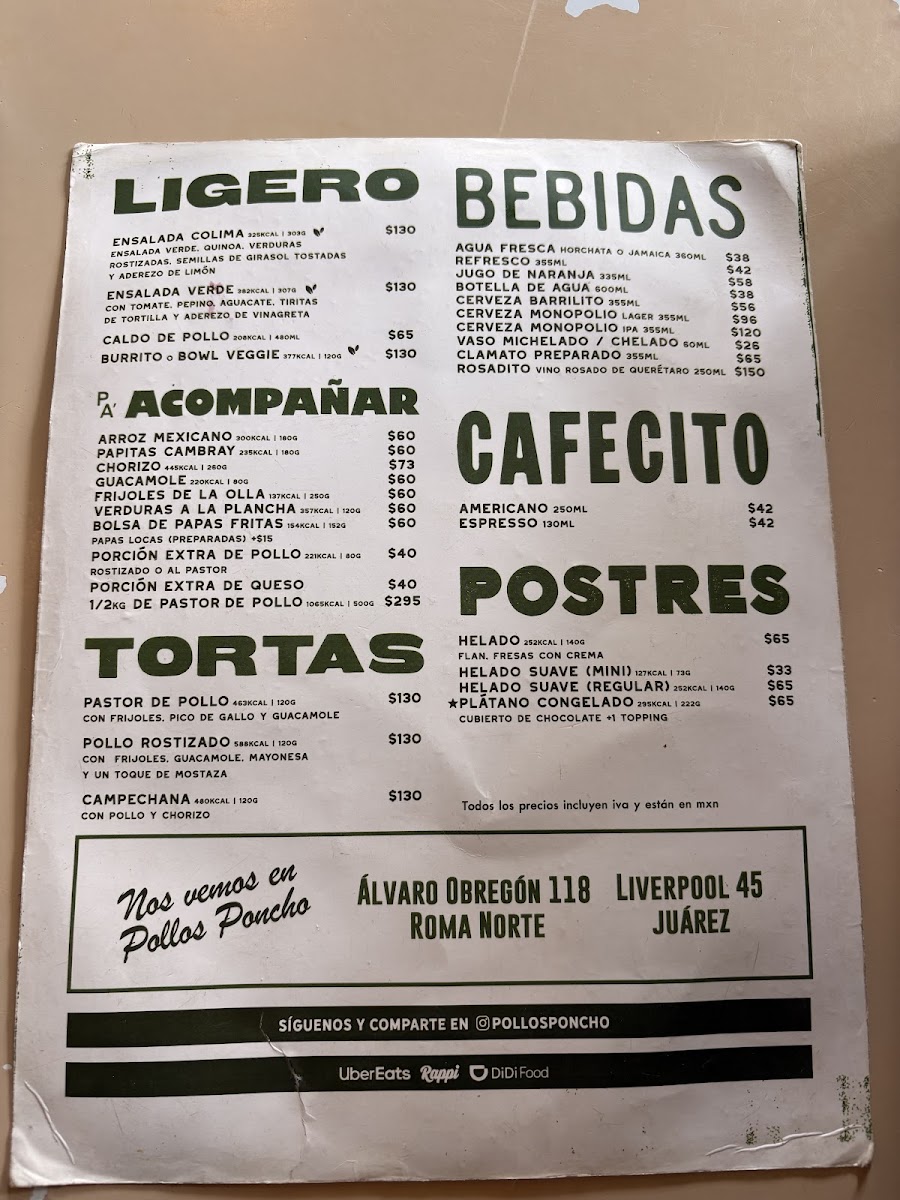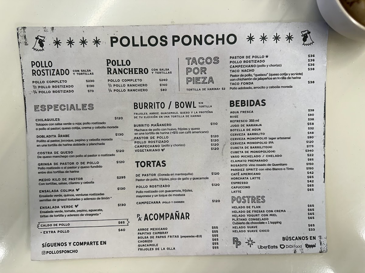 Welcome to Pollos Poncho, a hidden gem in the heart of Roma Norte, Mexico City, where chicken reigns supreme. This vibrant eatery focuses on delivering bold, authentic flavors in a casual setting, making it a favorite for both locals and visitors. The menu features a variety of dishes, but some standout highlights include the tender pastor de pollo and succulent pollo rostizado. Customers rave about the taco offerings, particularly the mouth-watering Taco Fonda, which is a must-try. Diners can't get enough of the addictive house-made salsas, especially the red salsa that adds a delightful kick.